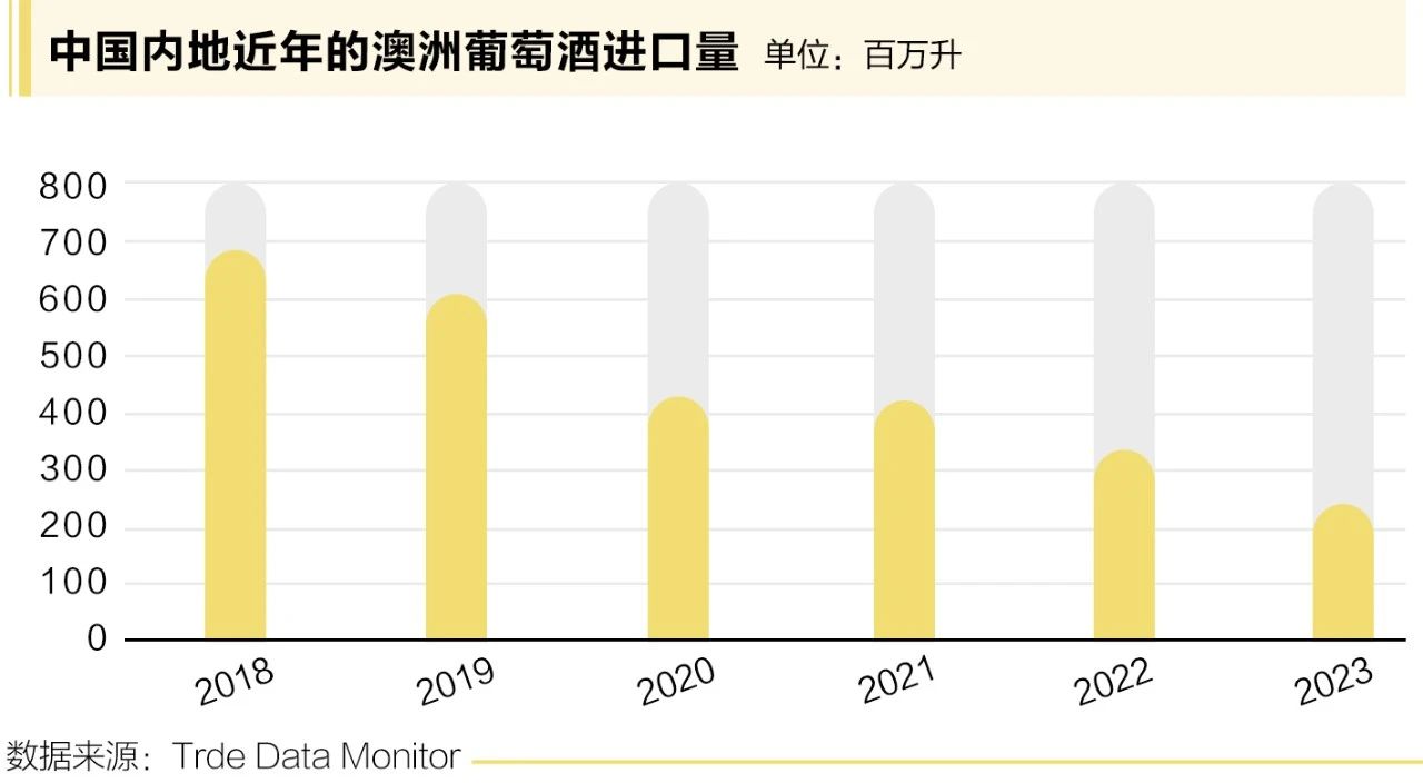 貿(mào)易數(shù)據(jù)監(jiān)測公司(Trade Data Monitor)的官方進(jìn)口統(tǒng)計(jì)數(shù)據(jù)顯示,中國的葡萄酒進(jìn)口總量是5年前的1/3,從2018年的6.88億升降至2023年的2.48億升。按價(jià)值計(jì)算,自2019年以來,中國進(jìn)口葡萄酒市場的規(guī)模減少了一半以上,從33億澳元降至去年的15億澳元。2023年,中國進(jìn)口葡萄酒的前四大來源國——法國、智利、意大利和西班牙都出現(xiàn)了大幅下降。