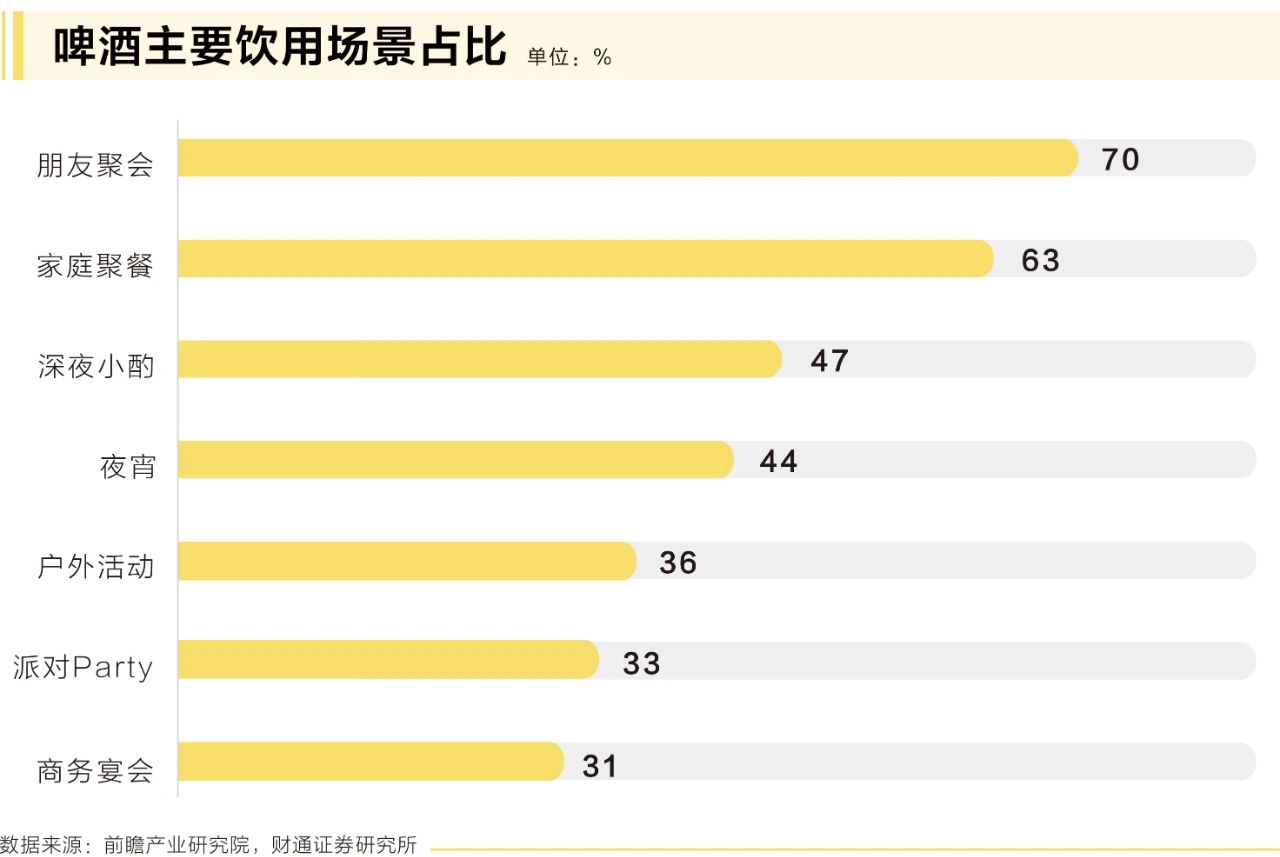 啤酒消費場景多元,“品酒”中的價值概念豐富了啤酒消費訴求。近年來,隨著社會經濟快速發展和人們生活方式的日新月異,啤酒飲酒觀念由過去的“拼酒”向如今的“品酒”消費轉變,“微醺自由”“深夜酒館”日漸流行,越來越多的年輕人不再把買醉作為喝酒目的,拋開啤酒最主要的佐餐屬性,悅己、解壓和社交也成為人們喝酒的目的和初衷。場景的精準定位可以使得產品有更清晰的定位和受眾,為企業提供了更高的平均售價及由此帶來的盈利能力,為培育大單品創造了可能。