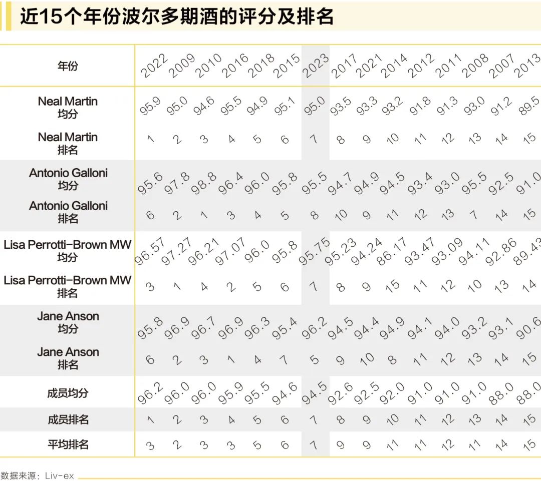 與Liv-ex成員相比,四位知名評論家——Neal Martin、Antonio Galloni、Lisa perroti - brown MW和Jane Anson給出的平均得分略高,但他們都認為,2023年是近年的中等年份。