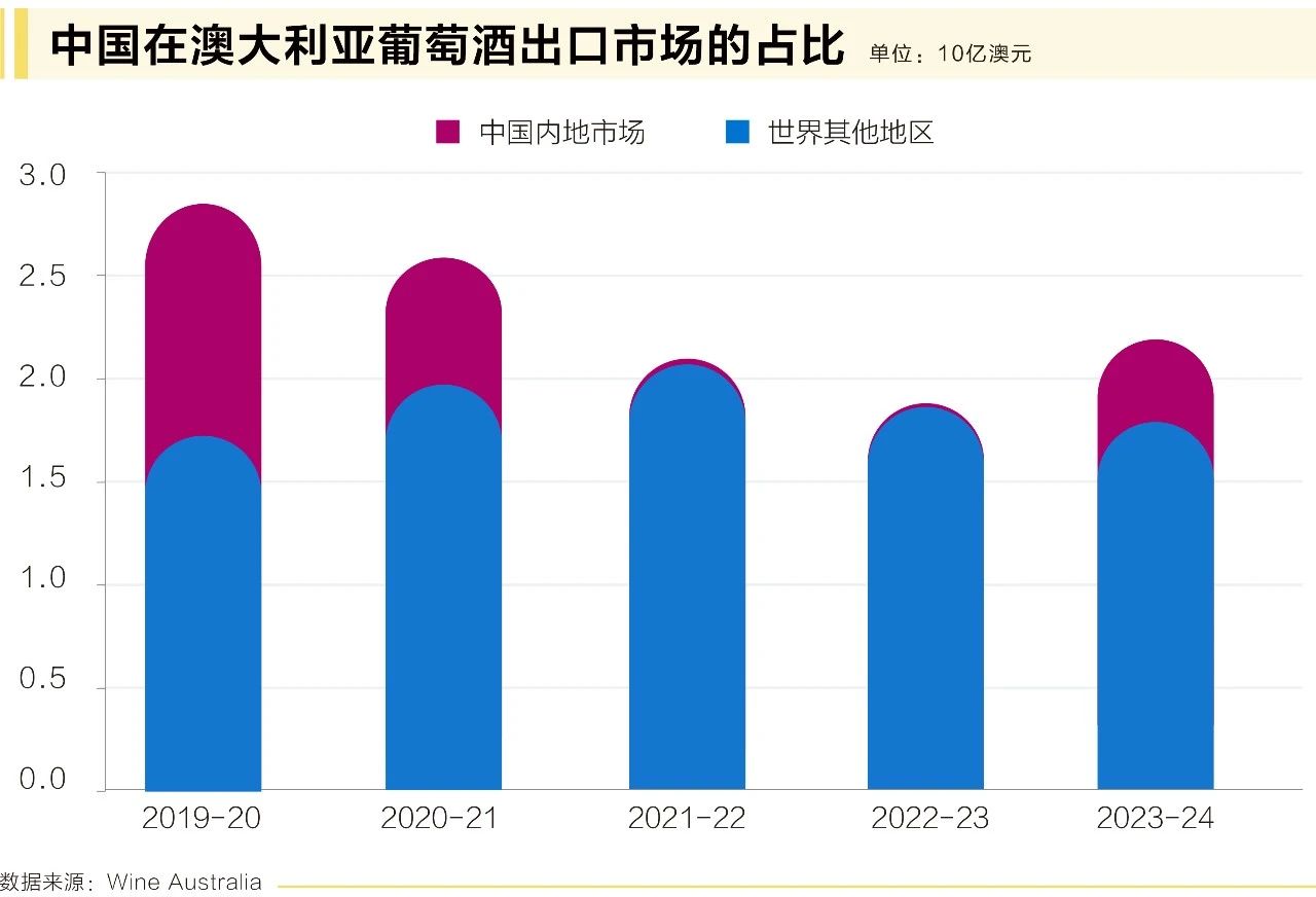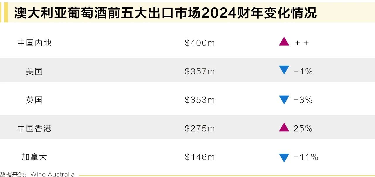出口額的增長(zhǎng)是由于在本財(cái)年的最后3個(gè)月,澳大利亞對(duì)中國(guó)內(nèi)地的出口激增,出口量從1000千升增加到33,000千升,出口額比上一財(cái)年增長(zhǎng)3.92億澳元至4億澳元。在2024年3月底中國(guó)取消對(duì)澳大利亞瓶裝葡萄酒的關(guān)稅后,澳大利亞葡萄酒重新補(bǔ)充了供應(yīng)渠道。