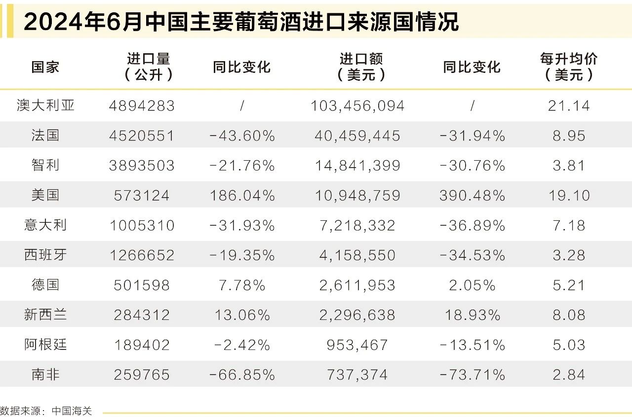 僅在6月份,澳大利亞的瓶裝葡萄酒進(jìn)口量就達(dá)到4890千升,價(jià)值1.03億美元,而去年同期進(jìn)口量為零。澳大利亞瓶裝葡萄酒的平均價(jià)格是前10大葡萄酒來源國(guó)中最高的,1-6月為22.45美元/升,表明高價(jià)葡萄酒大量涌入。