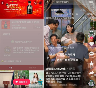 短視頻大賽在抖音平臺開展話題互動,通過豐厚獎勵,以更廣泛、更接地氣的方式傳播開來。古井貢酒不僅提升了用戶的參與度和積極性,更在潛移默化中引導了消費者的飲酒習慣和消費觀念。