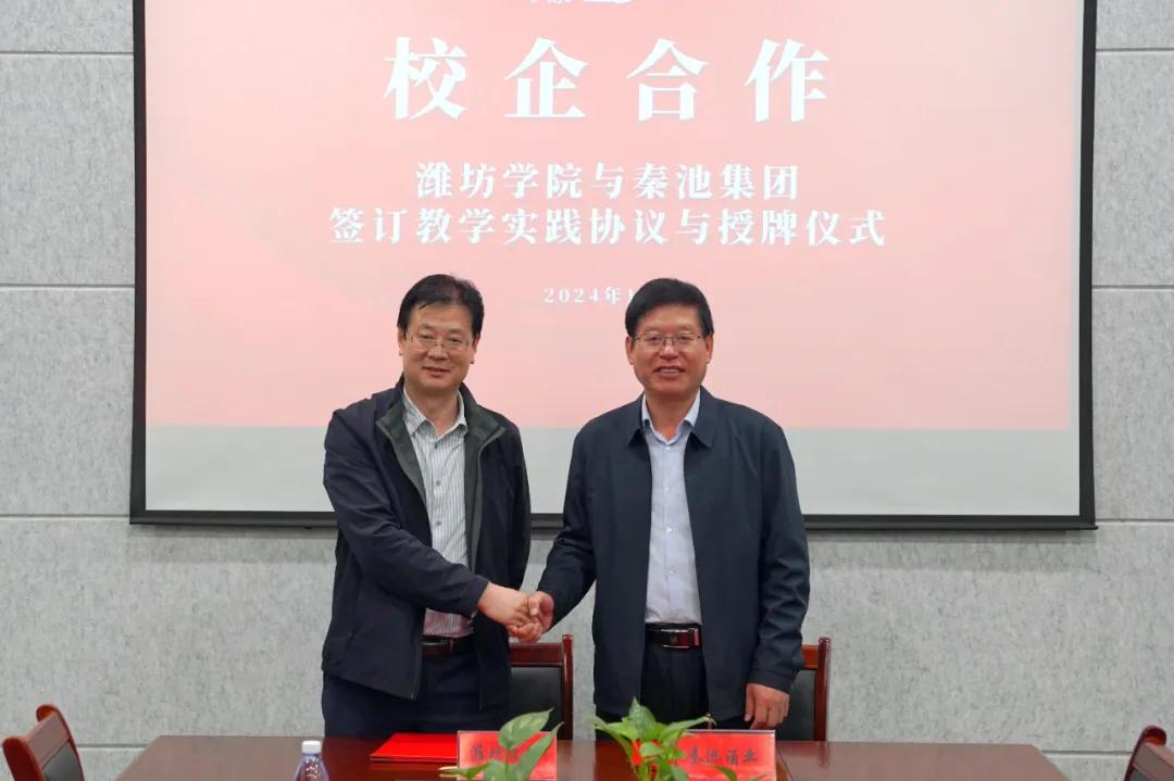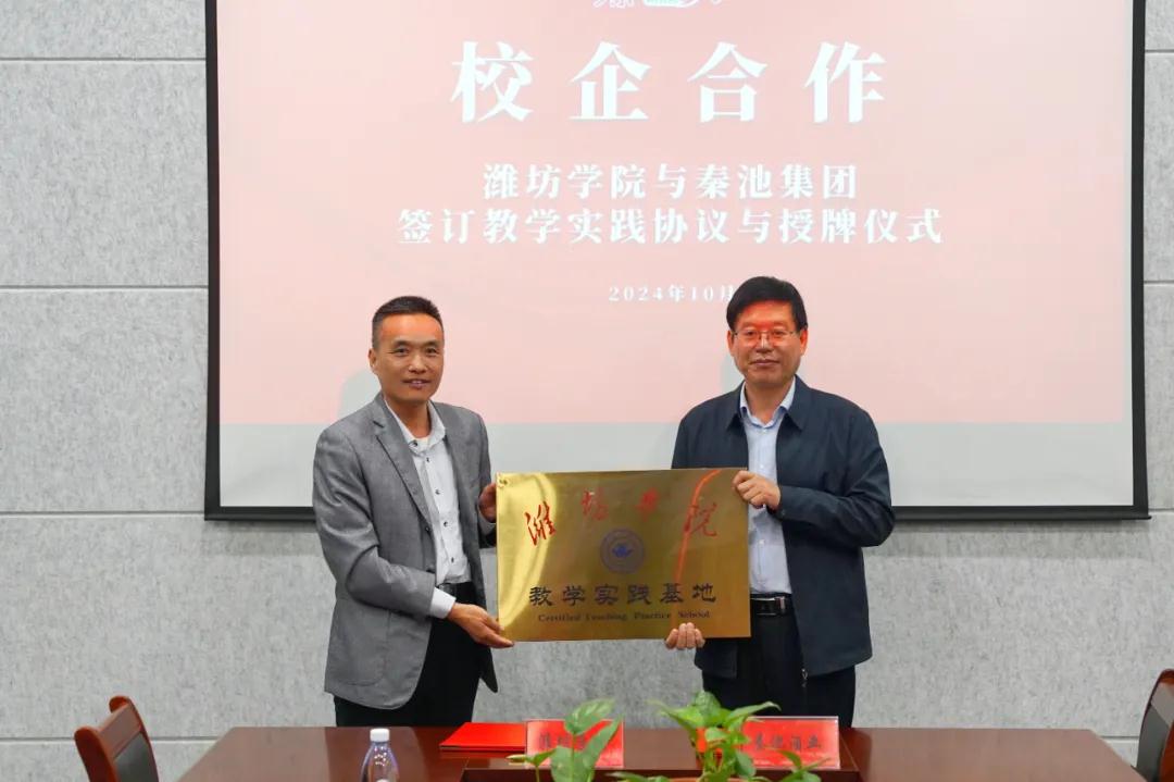 隨后,濰坊學(xué)院傳媒學(xué)院院長韓殿元與集團黨委副書記、工會主席魏學(xué)峰共同簽署《教學(xué)實踐基地協(xié)議書》;濰坊學(xué)院傳媒學(xué)院院長韓殿元向秦池授濰坊學(xué)院教學(xué)實踐基地牌。