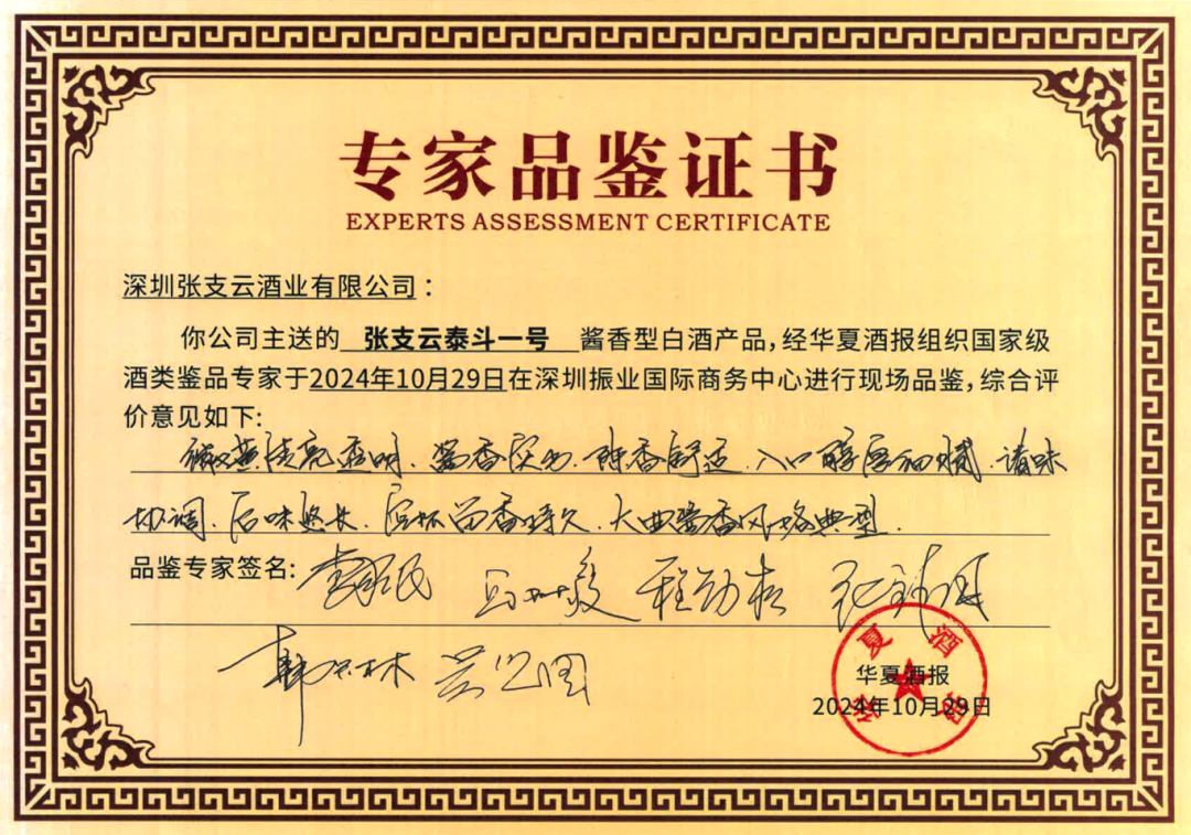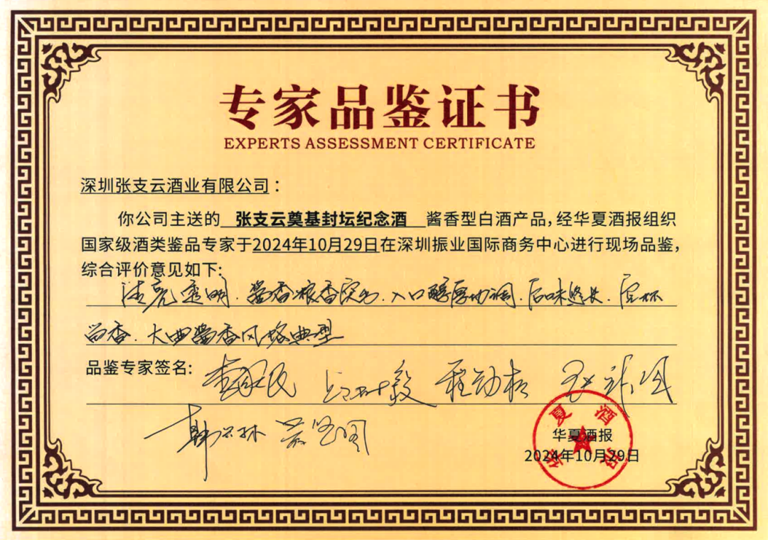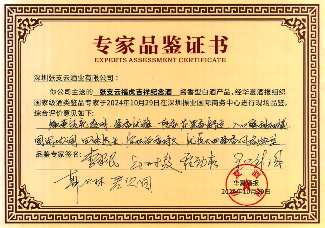 10月29日,張支云酒業集團在深圳市南山區舉辦了一場意義深遠的專家品評會,此次品評會不僅是對張支云酒品質的一次全面檢閱,更是一次對其未來發展前景的深入探討。來自全國的知名白酒專家齊聚一堂,中國釀酒大師、中國白酒大師、首席品酒師李家民,貴州大學釀酒與食品工程學院原院長、博士生導師邱樹毅,國家食品質量檢驗檢測中心副主任程勁松,中國釀酒大師、國井集團副總裁兼總工程師張鋒國,中國酒業協會白酒技術委員會委員、中國食品發酵工業研究院釀酒技術部主任韓興林,華夏酒報社長、中國酒業新聞網總編輯吳賢國等參與品評。在品評會上,專家們通過觀色、聞香、品味、定格等一系列專業步驟,對張支云酒業的三款產品——張支云奠基封壇紀念酒、張支云泰斗一號、張支云福虎吉祥紀念酒進行了細致的品評。最終,專家們一致給予了高度評價:張支云奠基封壇紀念酒:清亮透明,醬香、糧香突出,入口醇厚協調,后味悠長,空杯留香,大曲醬香風格典型。張支云泰斗一號:微黃清亮透明,醬香突出,陳香舒適,入口醇厚細膩,諸味協調,后味悠長,空杯留香持久,大曲醬香風格典型。張支云福虎吉祥紀念酒:微黃清亮透明,醬香優雅,陳香、花果香舒適,入口醇甜細膩,圓潤協調,回味悠長,空杯留香持久,優質大曲醬香風格典型。這些評價不僅反映了張支云酒的卓越品質,也體現了張支云酒業多年來的堅持——“品質就是生命”。品評會現場,張支云酒業集團總裁申潔萍表示:“品質是企業的生命線,是品牌長遠發展的基石。我們將不辜負行業專家的肯定,始終將產品質量放在首位,從原料選擇到釀造的每一個環節,都嚴格把控,力求做到最好。”
