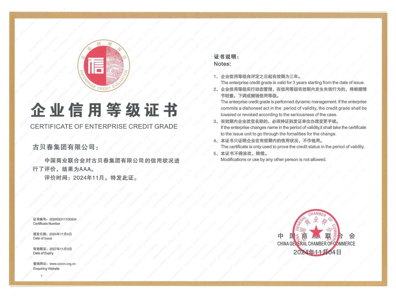 在誠信為金、質量至上的當下,企業信用已成為衡量企業發展潛力與市場競爭力的重要標尺。此次再度榮獲企業信譽等級“AAA”評級,不僅是對古貝春集團強大信用實力和穩健經營表現的充分肯定,更是對公司綜合實力、管理水平、債務償還能力和信用度等綜合能力的高度認可。這必將為古貝春集團未來發展奠定更加堅實的信用基礎,在激烈的市場競爭中脫穎而出開創更加輝煌的未來。