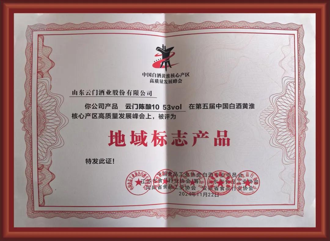 此次,云門陳釀·10 更是憑借其卓越的品質與獨特的風味,在眾多酒類產品中脫穎而出,榮獲“中國白酒黃淮核心產區地域標志產品”稱號。這一殊榮,不僅是對云門酒業長期堅持品質至上、精益求精的肯定,更是對云門酒業長期堅持“青州產區”白酒文化深厚底蘊與卓越釀造技藝的高度認可。