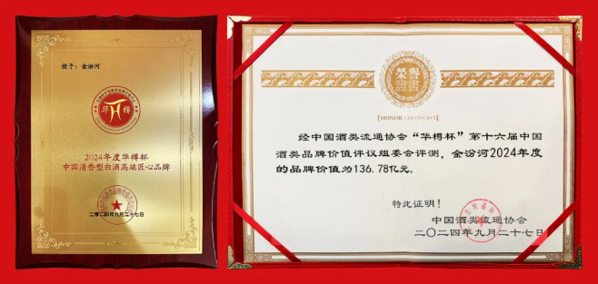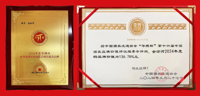 值得一提的是,兩個月前,經中國酒類流通協會“華樽杯”第十六屆中國酒類品牌價值評議組委會評測,金汾河2024年度的品牌價值為136.78億元,同時,金汾河斬獲“2024年度華樽杯中國清香型白酒高端匠心品牌”“2024年度華樽杯中國清香型白酒最具增長潛力品牌”“2024年度華樽杯中國白酒十大營銷案例品牌”三項殊榮。今日,“金汾河”再獲“北京知名商標品牌”,兼融“商標+品牌”雙位一體價值,可謂“金汾河”品牌加持“雙保險”,精準明確的商標品牌,為消費者甄選好酒提升了辨識度。