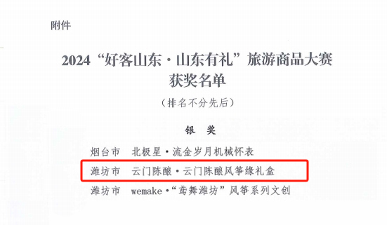 近日,由山東省文化和旅游廳主辦,山東省旅游推廣中心承辦,山東省旅游行業(yè)協(xié)會協(xié)辦的2024“好客山東·山東有禮”旅游商品大賽經(jīng)過各市初評推薦、專家復(fù)評、專家終評、社會公示等環(huán)節(jié),公布獲獎結(jié)果。由云門酒業(yè)選送的“云門陳釀·風(fēng)箏緣”禮盒,被評為2024“好客山東·山東有禮”旅游商品大賽銀獎。