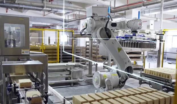 古井貢酒股份有限公司智能園釀造四部制曲車間副主任朱林介紹:“小車通過5G信號與中控進行信號交互,然后與中控進行信號對接,由中控下達指令,小車去執行任務。一輛小車每次可以拉一組曲架,每天總共有4房出入房任務,生產效率比傳統車間要高一倍左右。”