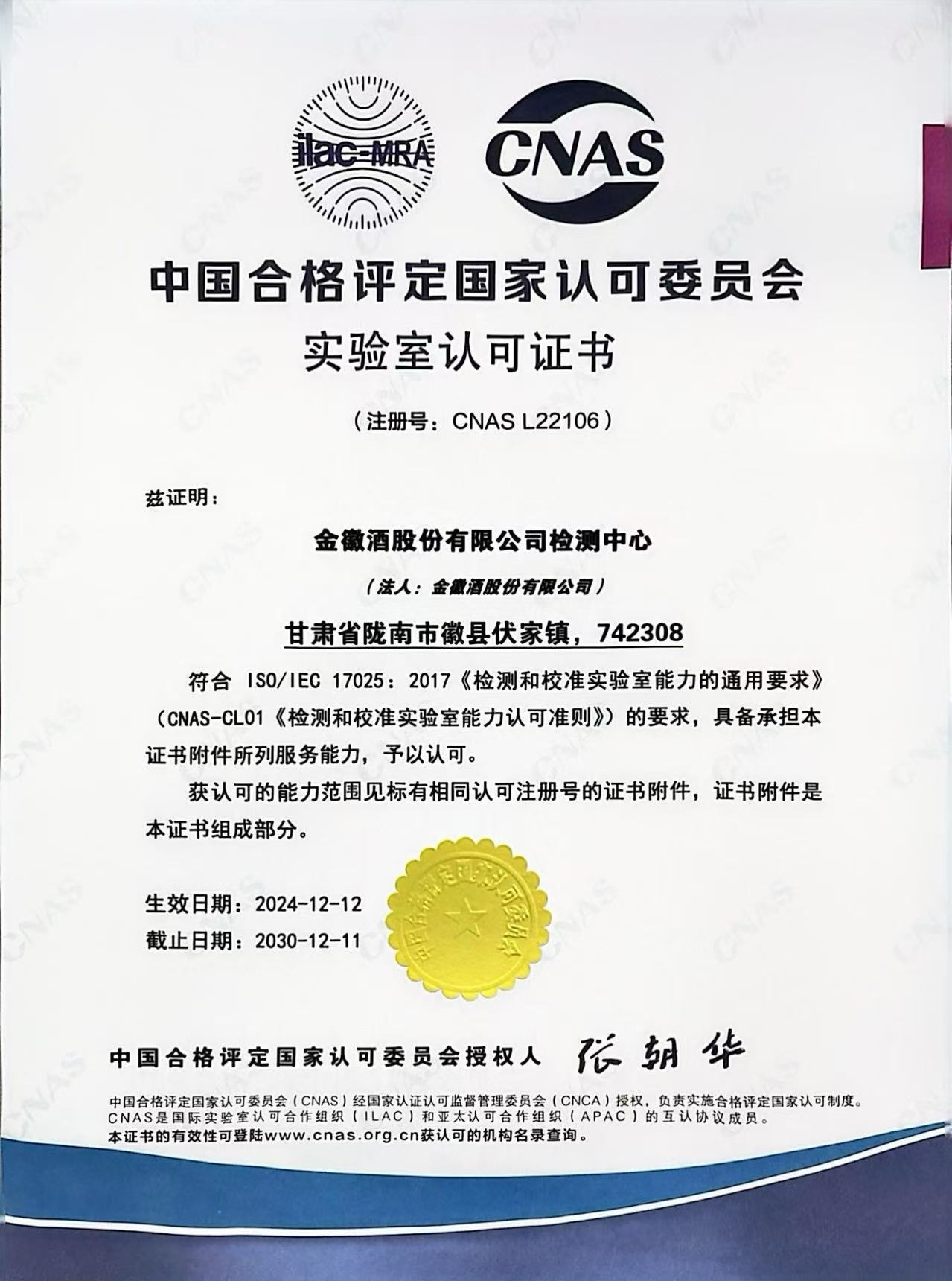 12月,金徽酒檢測中心通過中國合格評定國家認可委員會認可評審,并獲得其授予的實驗室認可證書(注冊號CNAS L22106)。此次獲得CNAS認可,意味著金徽酒檢測中心出具的檢測報告將具有更廣泛的國際互認性,為市場拓展以及品牌信譽的提升奠定了堅實的基礎。