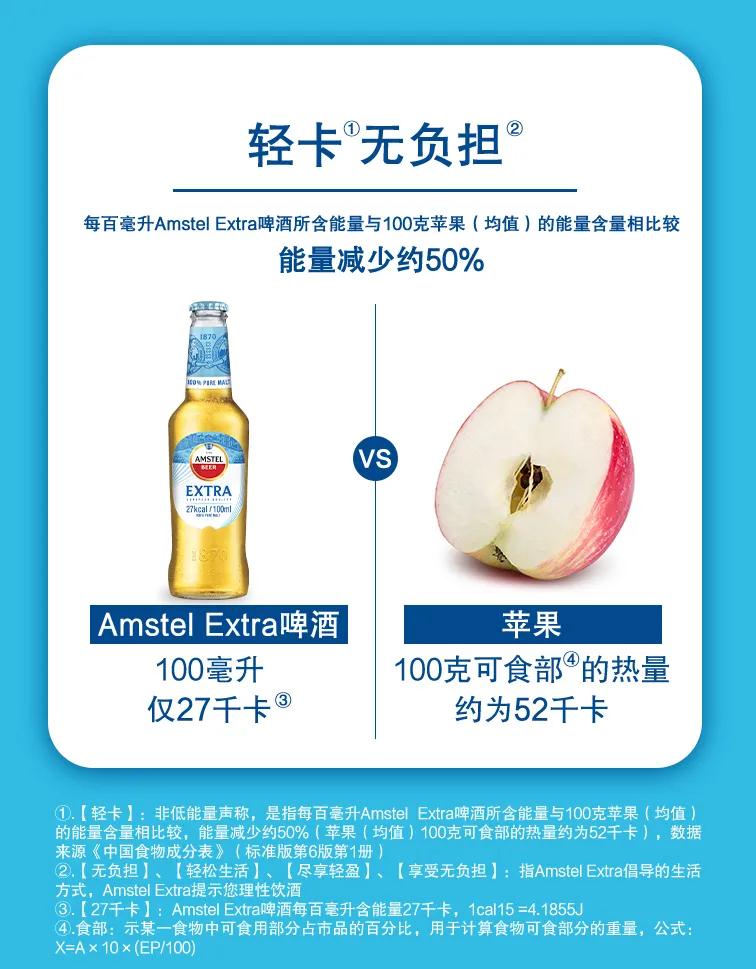 Ⅰ【輕卡】:非低能量聲稱,是指每百毫升Amstel Extra啤酒所含能量與10克蘋果(均值)的能量含量相比較,能量減少約50%(蘋果(均值)100克可食部的熱量約為52千卡),數據來源《中國食物成分表》(標準版第6版第1冊)