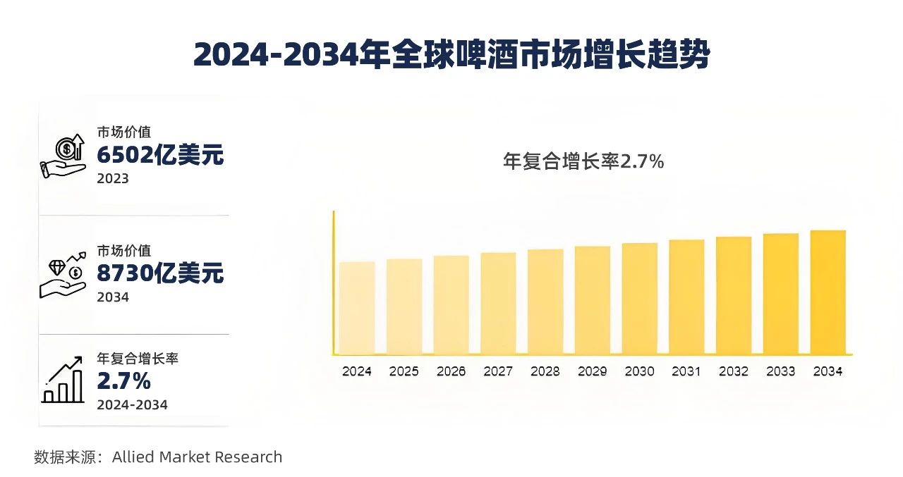 消費者對精釀啤酒和高端啤酒的興趣日益增加,可支配收入的不斷增長,口味和釀造技術的創新,以及分銷渠道的擴大,將持續推動啤酒市場的發展。根據聯合市場研究公司(Allied Market Research)最新發布的《全球啤酒市場2024-2034機會分析和行業預測》報告,啤酒市場在2023年的價值為6502億美元,預計到2034年將達到8730億美元,從2024年到2034年的復合年增長率為2.7%。