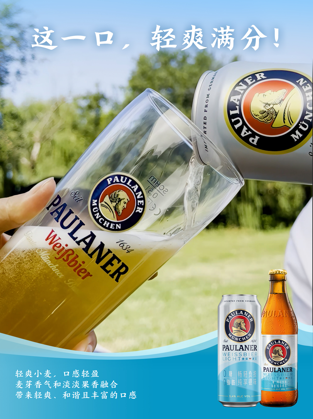 “這一口,輕爽滿分”是保拉納輕爽小麥啤酒給予消費(fèi)者的第一印象。這款啤酒采用輕爽小麥釀造,酒體清亮金黃,自然渾濁,帶有白色綿密蓬松的泡沫頂冠,麥芽香氣和淡淡的果香完美融合,淡淡的苦味作為平衡,輕盈又輕爽,和諧且豐富。“這一杯,輕盈滿足”是對(duì)這款啤酒的精準(zhǔn)描述。保拉納輕爽小麥啤酒在保持口感輕爽的同時(shí),實(shí)現(xiàn)了0糖0脂肪,酒精度3.4%,讓消費(fèi)者能夠暢享愉悅。“這一刻,輕松滿上”是對(duì)這款啤酒飲用場(chǎng)景廣泛適用性的強(qiáng)調(diào)。保拉納輕爽小麥啤酒能帶給你輕松與愉悅,無(wú)縫融入生活的每一個(gè)精彩瞬間。中午宅家歡聚,保拉納輕爽小麥啤酒以其輕盈爽口的特質(zhì),讓家中的聚會(huì)氛圍更加輕松自在。每一次舉杯共飲,它不僅是一種味覺(jué)的享受,更是拉近親朋好友距離、促進(jìn)彼此交流的絕佳媒介。下午時(shí)分戶外撒野,無(wú)論是露營(yíng)還是在草地上靜享微風(fēng),在享受自然的同時(shí),純正的德國(guó)小麥啤酒風(fēng)味在口中綻放,為心靈帶來(lái)一次小小的放飛。日落時(shí)分露臺(tái)休閑,來(lái)一杯保拉納輕爽小麥啤酒,伴隨著微風(fēng)拂面,讓心靈得到片刻的寧?kù)o,讓保拉納的輕爽獎(jiǎng)勵(lì)勞累了一天的自己,去除班味,一身輕松。晚間美食與酒時(shí)刻,保拉納輕爽小麥啤酒無(wú)疑是搭配火鍋、燒烤、小龍蝦這類佳肴的絕佳選擇,其以輕盈的口感和層次豐富的風(fēng)味,巧妙地中和了食物的油膩感,而麥芽帶來(lái)的絲絲甘甜,更是與各種味道相得益彰,為味蕾帶來(lái)一場(chǎng)和諧美妙的盛宴。值得一提的是,這款產(chǎn)品為德國(guó)原裝進(jìn)口,每個(gè)工藝步驟都由保拉納釀酒大師嚴(yán)格把控,嚴(yán)選優(yōu)質(zhì)原料,經(jīng)典德式小麥釀造工藝,打造獨(dú)特的保拉納輕爽小麥啤酒。