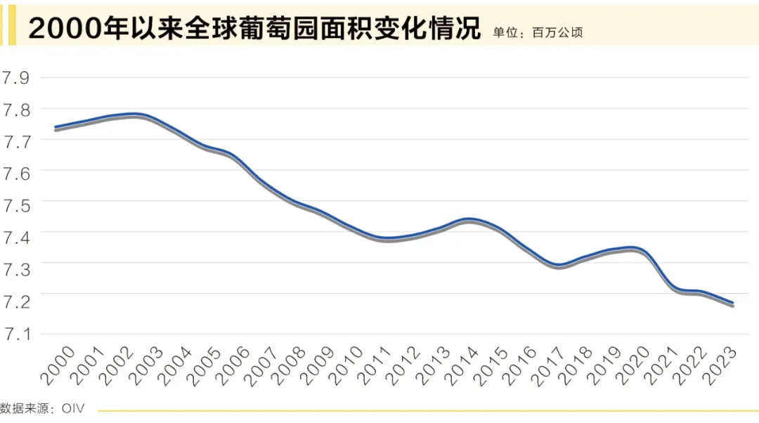 2023年,全球葡萄園面積為720萬公頃,與2022年相比略有下降0.5%。這意味著全球葡萄種植面積連續(xù)第三年萎縮,這一趨勢(shì)主要是由于兩個(gè)半球主要葡萄種植國的葡萄園面積減少。此外,從2012年到2020年,中國的葡萄園面積一直是世界葡萄園增長的主要驅(qū)動(dòng)力之一,從2020年開始穩(wěn)定下來。