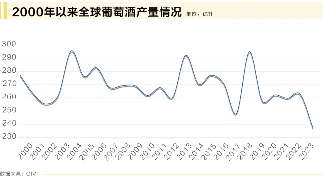 這一年,極端的氣候條件和廣泛的真菌病害嚴(yán)重影響了全球許多葡萄園,最終導(dǎo)致葡萄酒產(chǎn)量下降9.6%至237億升,為1961年以來的最低值。
