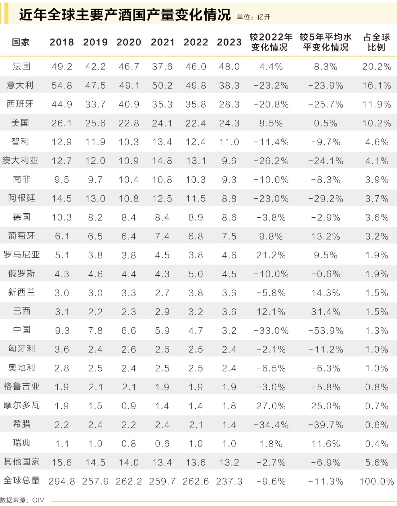 根據(jù)國際葡萄與葡萄酒組織(OIV)最新發(fā)布的報(bào)告,由于產(chǎn)量處于歷史低位,加之通脹壓力的影響,2023年全球葡萄和葡萄酒行業(yè)面臨嚴(yán)峻挑戰(zhàn)。