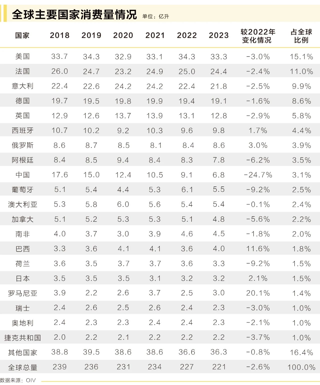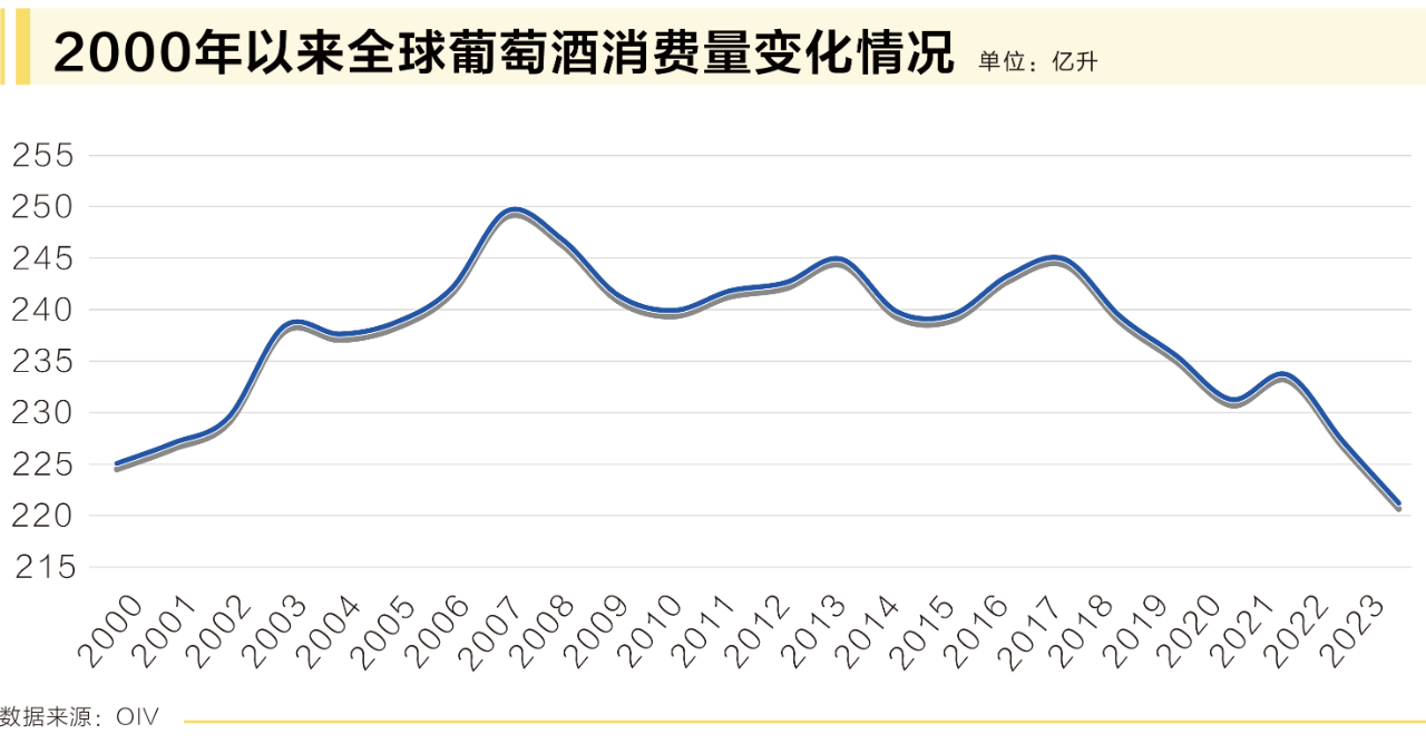 伴隨著消費(fèi)者購買力下降,2023年全球葡萄酒消費(fèi)量預(yù)估為221億升,下降2.6%,這或?qū)⑹?996年以來記錄的最低值。