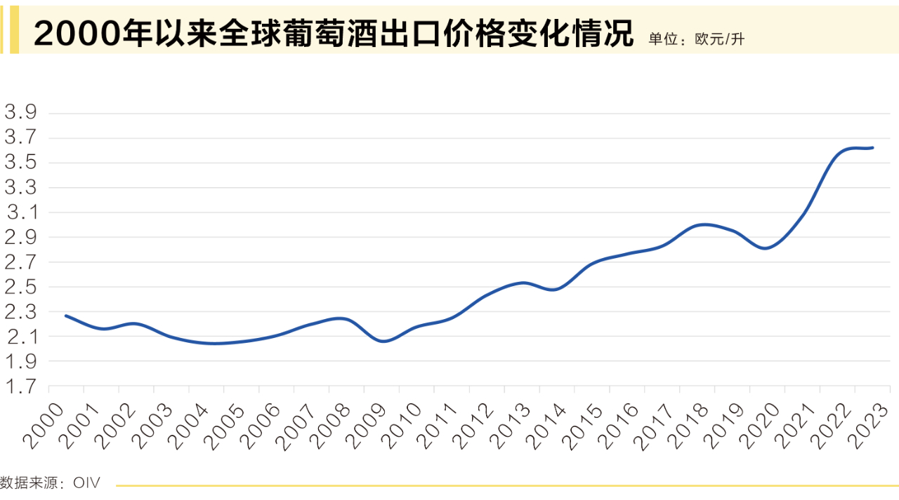2023年,全球葡萄酒平均出口價(jià)格達(dá)到3.62歐元/升,與2022年相比增長2%,創(chuàng)下歷史最高紀(jì)錄。自2020年以來,這一數(shù)字增長了29%。價(jià)格上漲的主要原因是生產(chǎn)商、進(jìn)口商和分銷商的成本上升,這是全球通脹壓力帶來的直接后果。