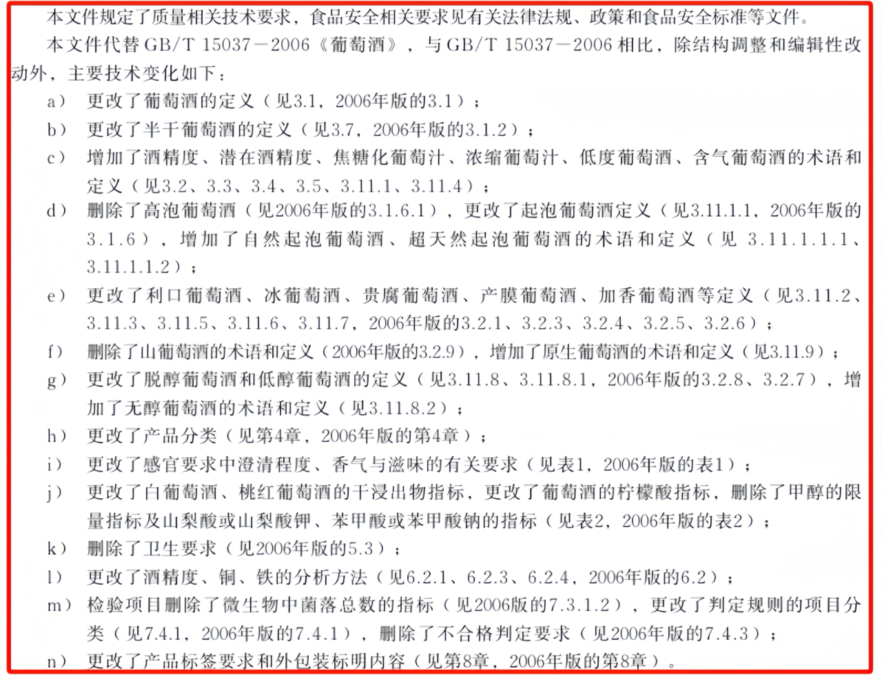 相較之前在葡萄酒產銷領域執行的GB/T 15037-2006《葡萄酒》,《葡萄酒質量要求(報批稿)》更改了葡萄酒、半干葡萄酒、起泡葡萄酒、貴腐葡萄酒、加香葡萄酒等定義,增加了自然起泡葡萄酒、超天然起泡葡萄酒的術語和定義,更改了白葡萄酒、桃紅葡萄酒的干浸出物指標,更改了葡萄酒的檸檬酸指標,刪除了甲醇的限量指標及山梨酸或山梨酸鉀、苯甲酸或苯甲酸鈉的指標等。
