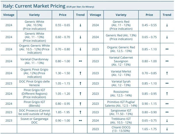 意大利的葡萄采收開始得異常早,今年早些時候的干燥天氣減少了普利亞的產量,而冰雹、高溫和不均勻的成熟,給威尼托的生產商帶來了困擾。Ciatti的報告顯示,灰比諾的價格已經上漲了10%。當意大利和法國出現這類問題時,買家通常會轉向匈牙利、羅馬尼亞或摩爾多瓦,這些國家生產的灰比諾、霞多麗和長相思,都能滿足較低端的價格要求。然而,今年熱浪襲擊了東歐,也造成了同樣的問題。據路透社報道,由于生產商擔心是否能夠繼續釀造傳統風格的白葡萄酒,匈牙利比往常提前了一個月開始采收。意大利2023年的收成約比平均水平低25%,2024又是一個具有挑戰性的年份,多數地區都不同程度地經歷了冰雹、霉菌壓力、夏季干旱和極端溫度。大多數地區的初步估計都低于平均水平:DOC級灰比諾產量可能下降10%,馬爾凱-阿布魯佐下降20%,西西里下降30%-35%,普利亞大區的數據仍未出來。目前,意大利還沒有公布散裝葡萄酒的價格,不過,Med.&A. Broker Association和UIV Wine Observatory發布的葡萄初始價格可作為參考。普通紅葡萄(降27%)和白葡萄(降30%)的價格明顯低于去年,尤其是在普利亞。來自普利亞用于釀制IGP級別葡萄酒的桑嬌維塞(Sangiovese)和特雷比亞洛(Trebbiano),也經歷了類似的價格下跌。此外,威尼托灰比諾的價格上漲了約10%,而意大利本土白葡萄品種格雷拉(Glera)價格下降了4%。