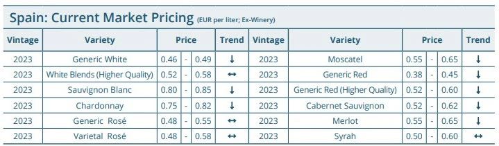 西班牙葡萄酒新聞網站Vinetur.com6月份預測,與2023年和5年平均水平相比,干旱將使今年葡萄產量減少20%-25%。然而,最新的估計顯示,西班牙的葡萄酒產量可能在43億升左右,預計品質良好——東部地區除外。過去一個月來,西班牙散裝酒市場一直很平靜。人們對西班牙的大豐收充滿信心,2024年份葡萄價格與2023年份基本持平,可能普通白葡萄酒會上漲10%。由于白葡萄酒供應短缺,一些需要立即采購白葡萄酒的買家已經進入市場,以合作社設定的價格進行有限批次的交易。然而,主要買家都在觀望國內、意大利和法國的收成情況,2023年份的少量白葡萄酒間歇性地上市并迅速售出;2023年份紅葡萄酒供應量增加,有的降價銷售,為新年份酒騰出空間。最新的OEMV統計數據顯示,與2023年上半年相比,西班牙1-6月的葡萄酒出口量增長了0.3%,而散裝酒出口量增長了2%。西班牙一些葡萄酒產區的出口正陷入困境——尤其是里奧哈(Rioja)等專注于瓶裝紅葡萄酒的北部地區,但由于意大利2023年收成不佳,歐洲對普通散裝葡萄酒的需求有所上升,加上西班牙散裝葡萄酒和入門級葡萄酒的貿易總體上相對強勁,西班牙的出口統計數據一直保持穩定。