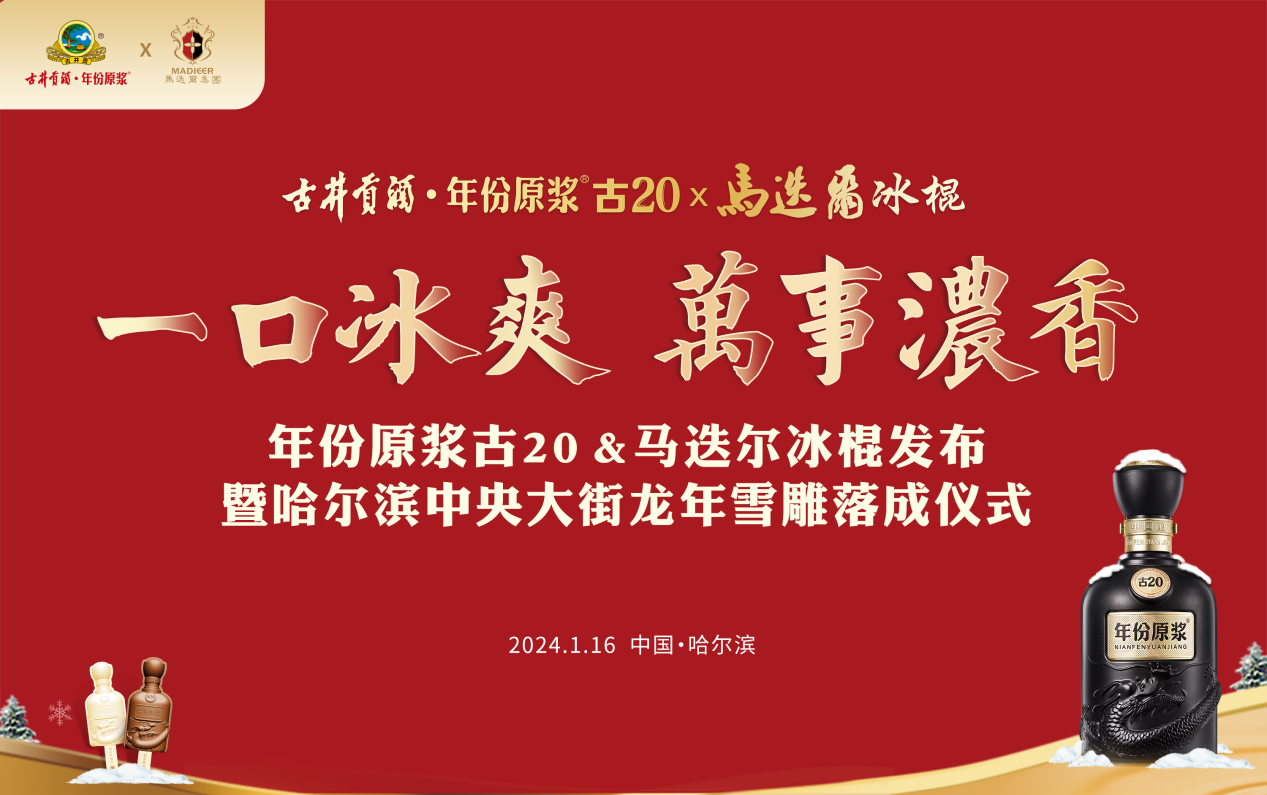 以酒為媒向北行,品牌聯名謀共贏!千年的古井貢酒,百年的馬迭爾品牌跨界合作,共同推出年份原漿·古20&馬迭爾聯合款冰棍,與哈爾濱中央大街合作,制作金龍送福雪雕。看北國風光、吃馬迭爾冰棍、品古20美酒,賞龍年雪雕,勢必會成為今冬又一道美麗的風景。