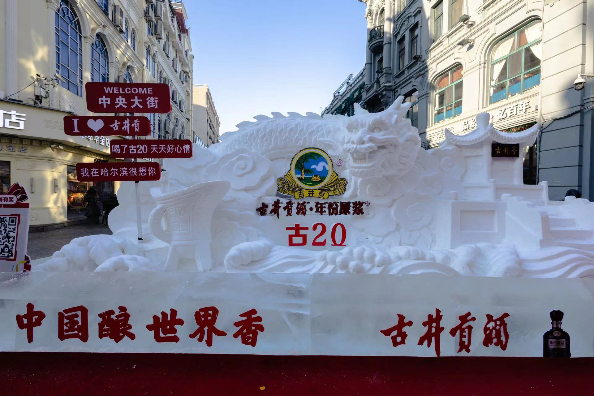 “沒想到古井貢也來到了中央大街!”“古井貢中國龍圖騰形象也太酷了!”······別出心裁的龍年雪雕吸引了大量的游客駐足打卡拍照。
