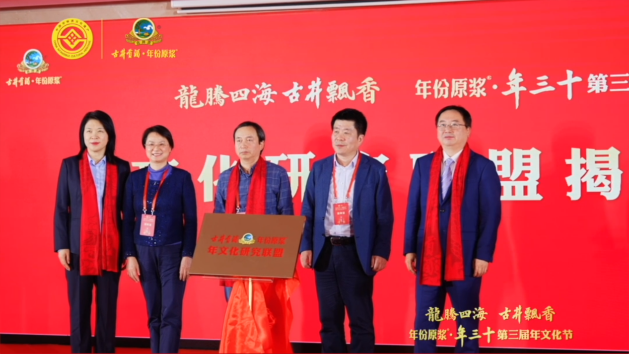 圖丨年文化研究聯盟揭牌(從左往右:古井集團黨委委員、副總裁程莉,安徽省文化和旅游廳黨組成員蔡小莉,華東師范大學特聘教授、中國智慧研究院院長貢華南,安徽廣播電視臺黨委書記、臺長、總編輯吳文勝,南京大學歷史學院院長張生。)