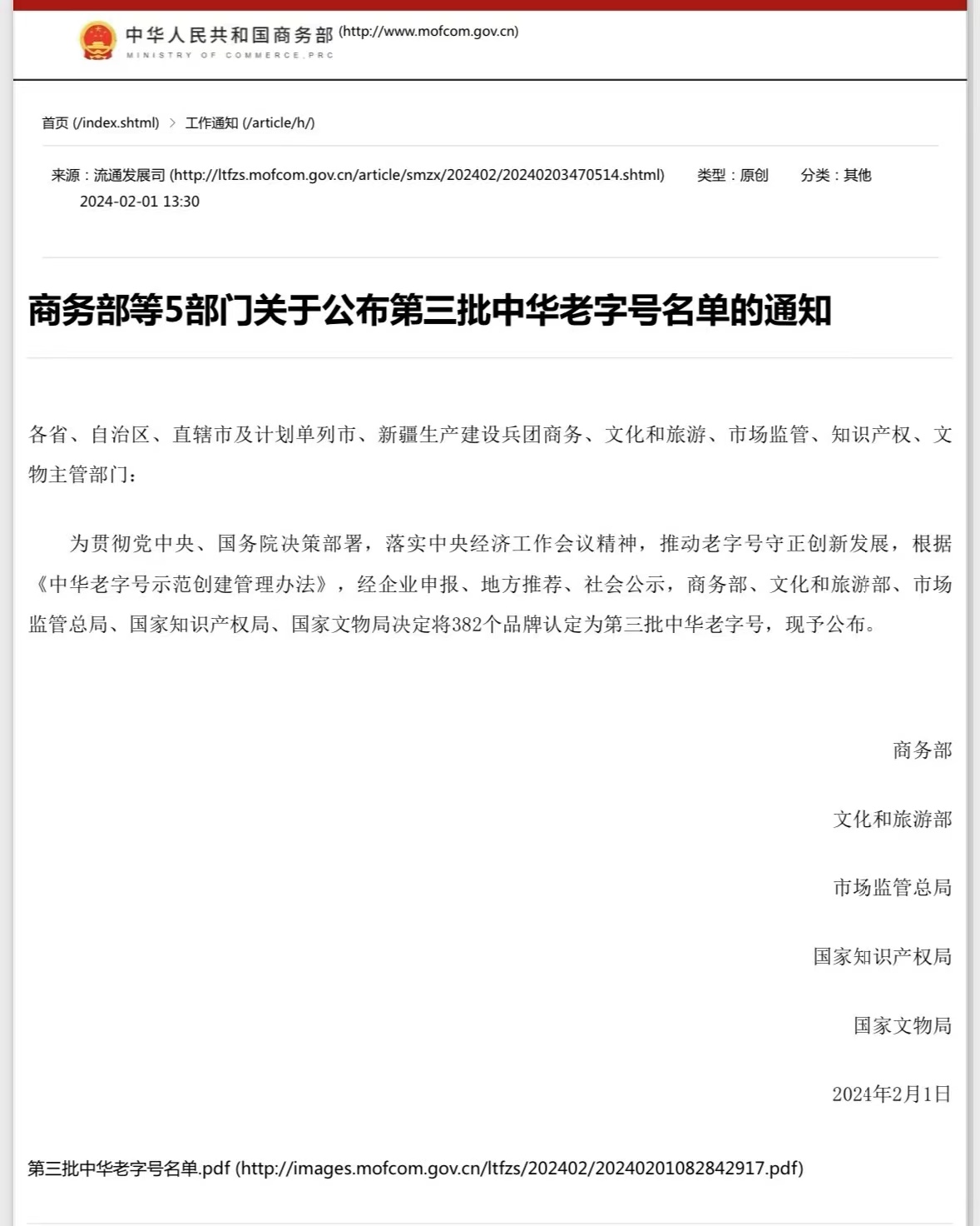 2024年2月1日,中國商務部網站發布《商務部等5部門關于公布第三批中華老字號名單的通知》,經企業申報、地方推薦、社會公示,商務部、文化和旅游部、市場監管總局、國家知識產權局五部委聯合評定,山西杏花村汾酒廠股份有限公司“竹葉青”品牌榮獲“中華老字號”稱號。汾酒成為擁有兩個“中華老字號”品牌的酒類企業,千年民族品牌“竹葉青”熠熠生輝,汾酒活態文化取得新突破。