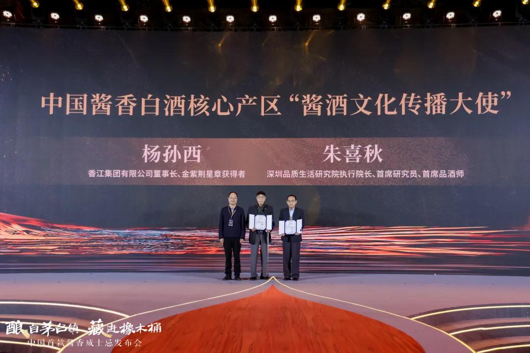 當天,在以“釀自茅臺鎮 藏進橡木桶”為主題的中國首款醬香威士忌發布會上,仁懷市委副書記、市人民政府市長李穎為香港香江集團董事長楊孫西,中國商業發展中心原主任、深圳品質生活研究院執行院長、首席研究員、首席品酒師朱喜秋,分別頒發了“中國醬香白酒核心產區醬酒文化傳播大使”榮譽。