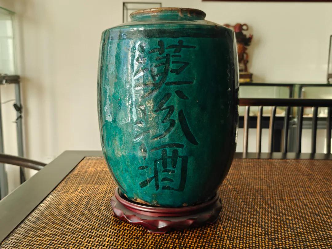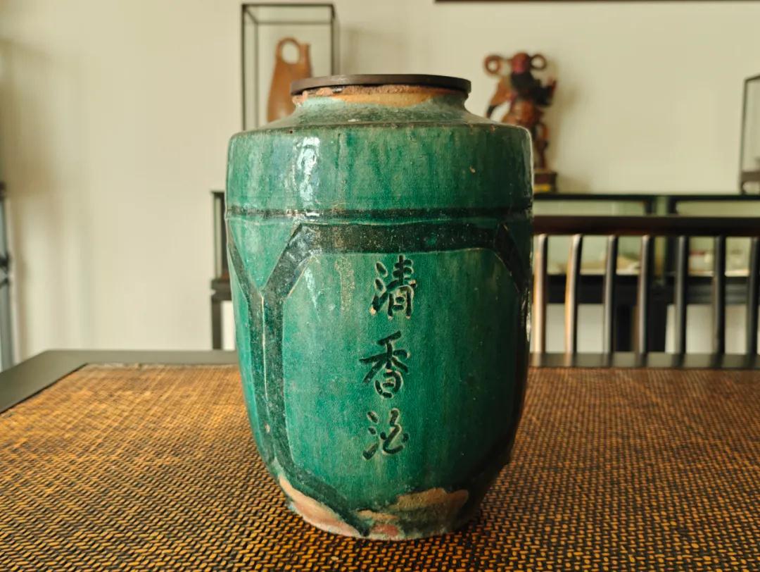 另一件重器也是湖南銅官窯孔雀綠的大酒壇,這個(gè)酒壇更為稀缺,因?yàn)榫茐峡逃小扒逑憔啤比齻€(gè)字。大家都知道,在第三屆全國(guó)評(píng)酒會(huì)之前,中國(guó)白酒是沒有香型劃分的。那么,這個(gè)酒壇上的“清香酒”是什么含義呢?