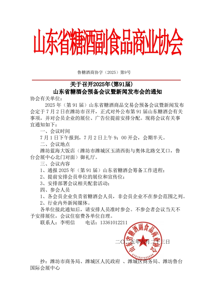 2025年(第91屆)山東省糖酒會(huì)預(yù)備會(huì)定于7月2日濰坊召開(kāi)!