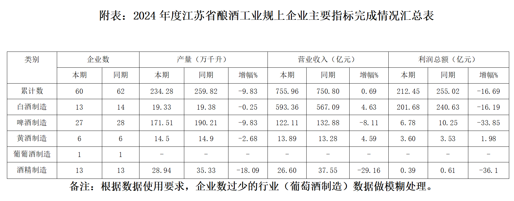 2024年,江蘇省酒業(yè)整體呈現(xiàn)“收入微增、利潤(rùn)承壓”態(tài)勢(shì),釀酒工業(yè)規(guī)上企業(yè)累計(jì)完成產(chǎn)量234.28萬(wàn)千升,同比下降9.83%;累計(jì)完成銷售收入755.96億元,同比增長(zhǎng)0.69%;累計(jì)完成利潤(rùn)總額212.45億元,同比下降16.69%,反映出行業(yè)盈利能力遭受嚴(yán)重?cái)D壓。