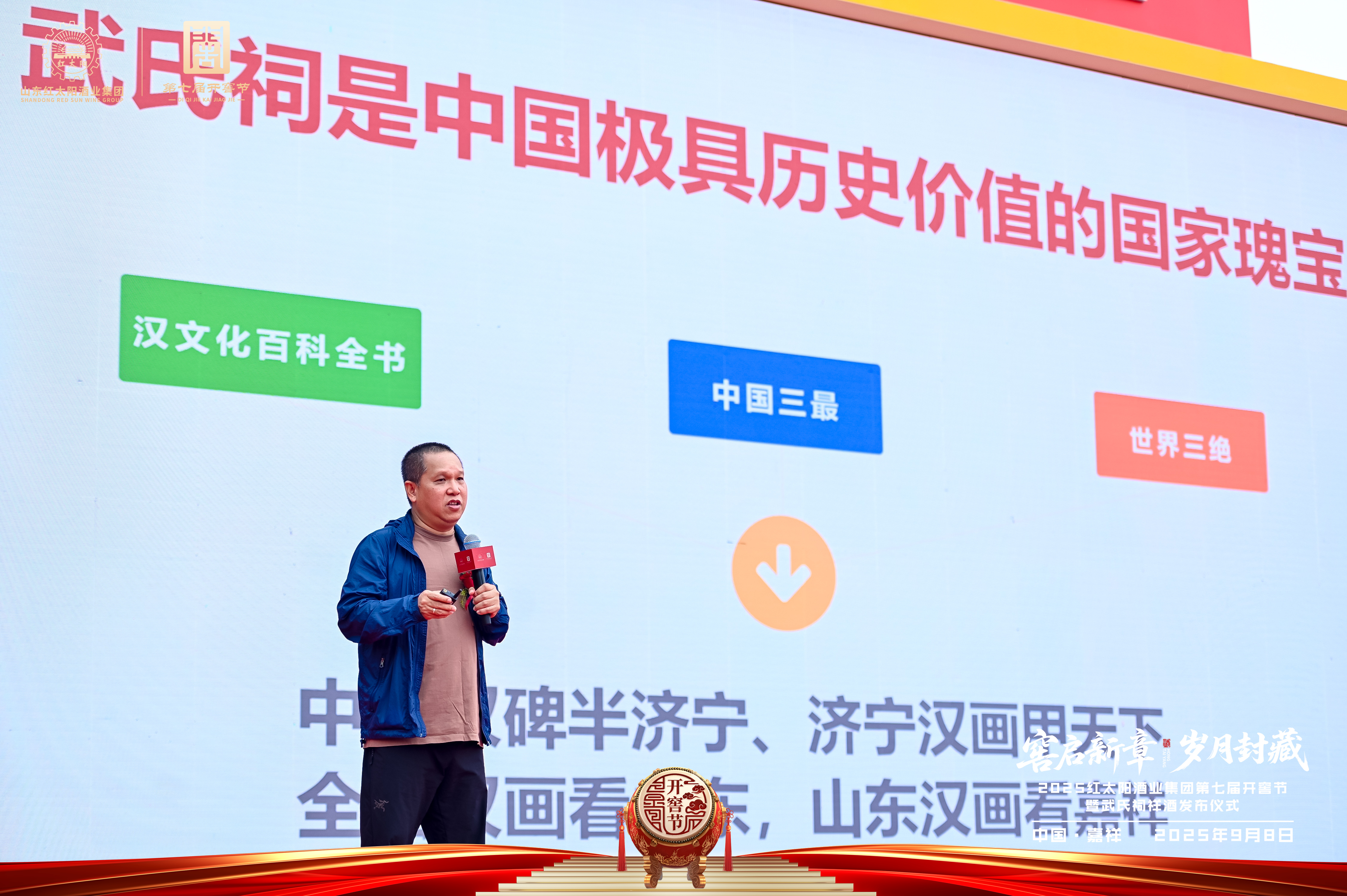 飛人谷營銷策劃有限公司董事長梁文峰,現場講述了“武氏祠祥酒聯名款”的文化內涵與設計理念,這款產品的瓶型設計,源自漢代青銅器卓越技藝的國寶之作——錯金銀鳥篆文銅壺,以天象為脈,以古器為骨,融星君巡宇之宏規、龍雀銜云之祥瑞于一體。華彩靈動間流光鑠金,浮雕祥紋中藏納乾坤,每一處細節都深植華夏文明基因,皆是對東方美學的致敬,盡顯高端大氣、熠熠生輝之美。