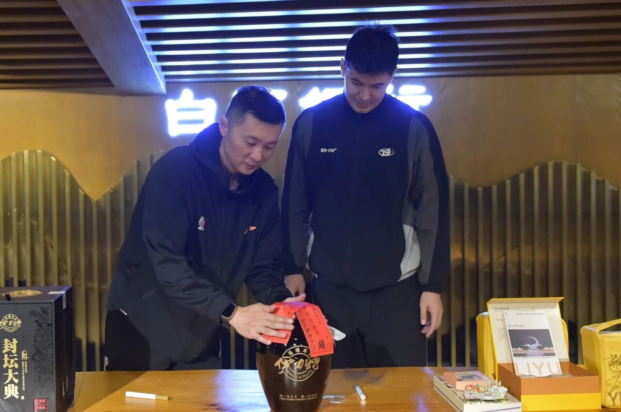 隨后的“酒體勾調”體驗更添趣味。講解員系統講解了白酒勾調知識后,隊員們在酒體設計師的輔助下,調制專屬“MVP特飲”,一次次調和、品鑒,如同賽場上的戰術磨合,耐心與精準缺一不可。主教練劉煒與隊長阿不都沙拉木則代表球隊,將一壇5L封壇酒簽名封存于白酒銀行,這壇酒不僅是此次駐訓的獨特見證,更是象征著體育精神與匠心文化的“時光沉淀”。
