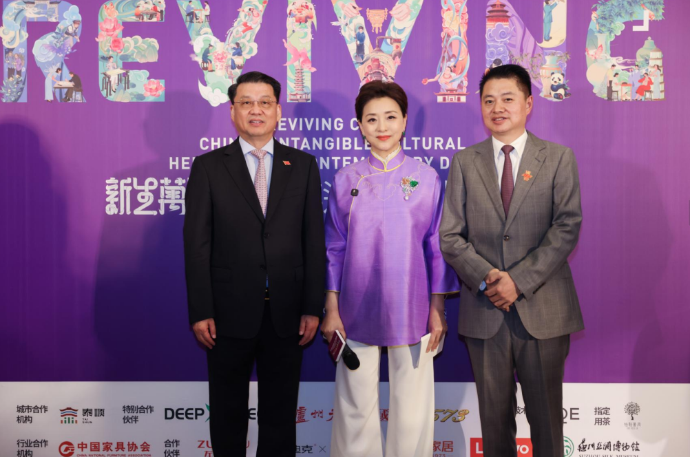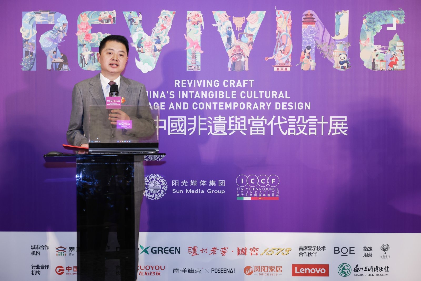 陽光媒體集團董事長、“新生萬物”系列展覽聯(lián)合策展人楊瀾(中),中華人民共和國駐米蘭總領(lǐng)事劉侃(左),瀘州老窖集團黨委副書記、副董事長、總裁廖俊(右)出席“新生萬物——中國非遺與當(dāng)代設(shè)計展”開幕式