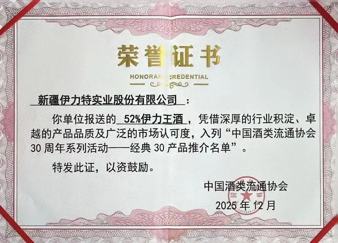 12月4日,中國(guó)酒類流通協(xié)會(huì)第八屆二次理事會(huì)暨30周年主題活動(dòng)在北京國(guó)際會(huì)議中心正式啟幕。會(huì)上,新疆伊力特實(shí)業(yè)股份有限公司憑借過硬的品質(zhì)管控與良好的行業(yè)信譽(yù),作為新疆唯一一家白酒企業(yè),成功通過2025年放心酒工程資格審核并獲授牌。同時(shí),其核心戰(zhàn)略產(chǎn)品52%vol伊力王酒,憑借其深厚的行業(yè)積淀、卓越的產(chǎn)品品質(zhì)以及廣泛的市場(chǎng)認(rèn)可度,成為新疆白酒唯一上榜“中國(guó)酒類流通協(xié)會(huì)30周年系列活動(dòng)——經(jīng)典30產(chǎn)品推介名單”產(chǎn)品。