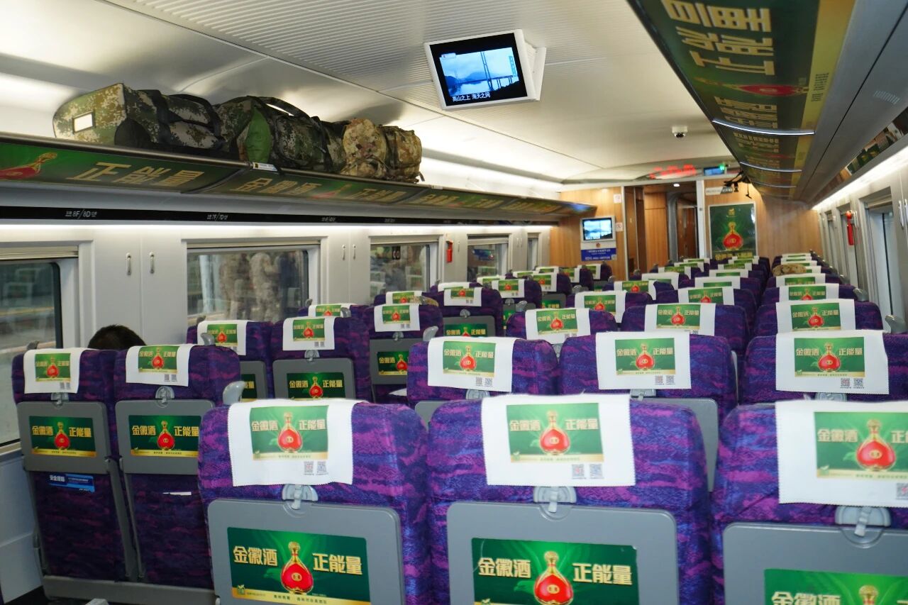 金徽酒高鐵專列采用全場景媒體覆蓋模式,通過外車身醒目的彩貼、車門海報、行李架天幕、頭枕巾、語音播報等八大傳播形式,打造沉浸式品牌體驗空間,讓乘客在旅途全程感受金徽酒的生態釀造理念與文化底蘊。