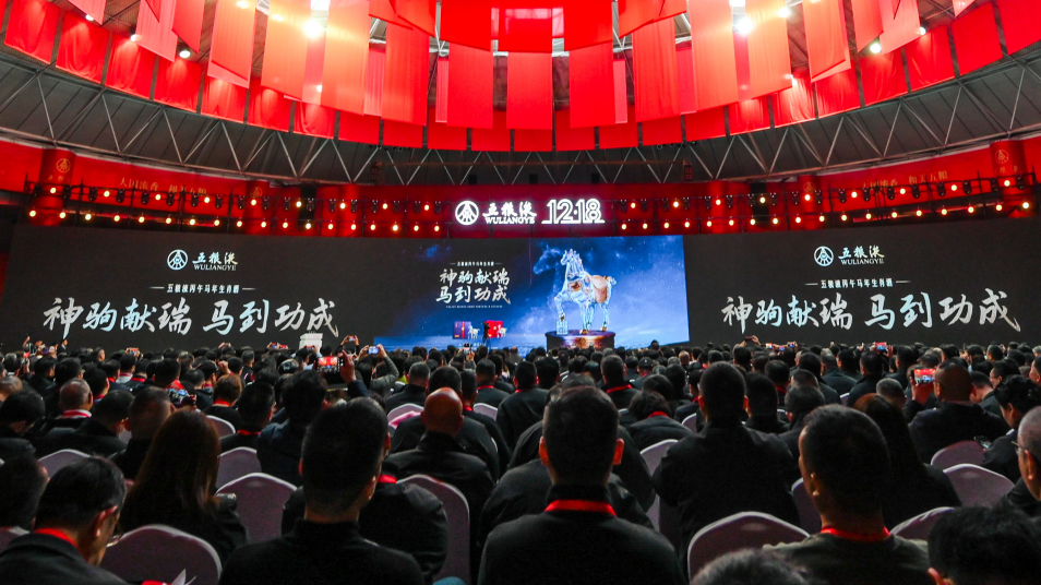 大會現場,五糧液丙午馬年生肖酒的發布成為一大亮點。這款生肖酒以昭陵六駿之首“颯露紫”為器型,采用“雙色漸變玻璃”工藝,馬鞍融入“寶相花+五谷紋”設計,馬栓印有“馬到成功”印章,盡顯藝術質感。酒體傳承國家級非物質文化遺產釀造技藝,年產能占比僅萬分之五,每盒配備唯一編號與收藏證書,兼具高端性、藝術性與稀缺性,既是獻禮馬年的文化珍品,也寓意著五糧液與合作伙伴乘風破浪的發展愿景。