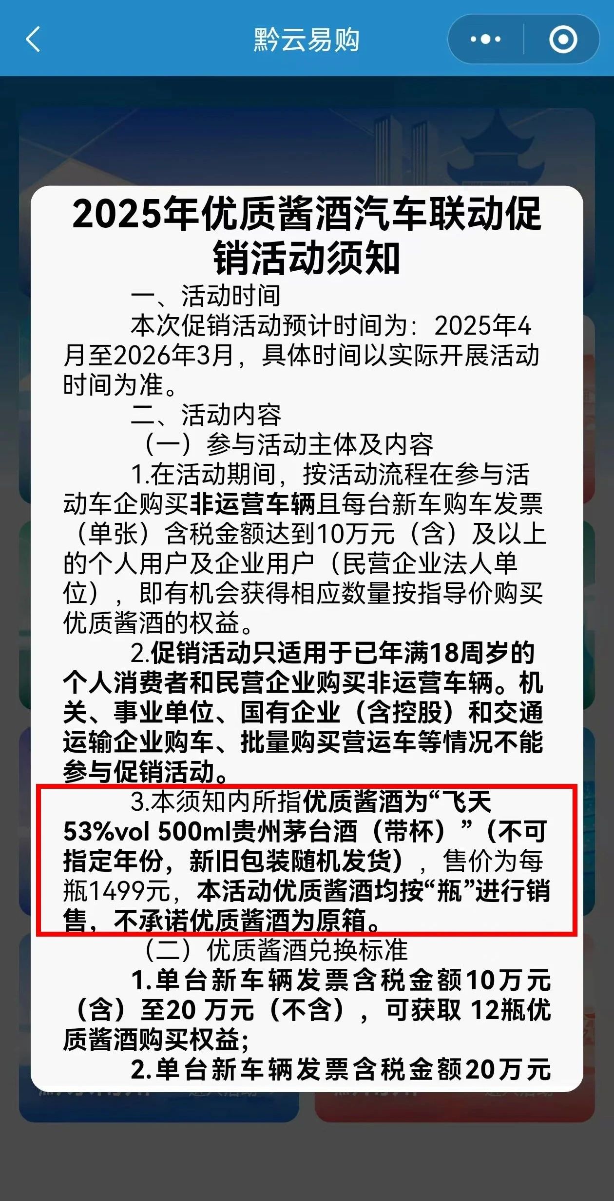 簡而言之,就是消費達到一定的數額,就可以平價購買一定數量的優質醬酒。盡管《公告》中并未明確指出具體是哪種醬酒,但《華夏酒報》記者通過《公告》發布的小程序“黔云易購”了解到,這里提到的優質醬酒,指的是售價為1499元/瓶的“飛天53%vol 500ml貴州茅臺酒(帶杯)”。