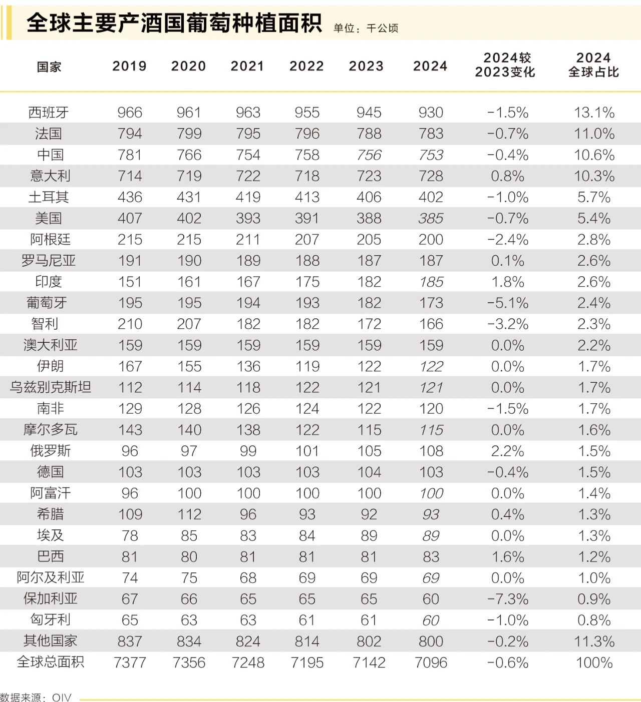 中國葡萄園面積穩定在75.3萬公頃(-0.4%),結束了2000年-2015年期間年均4.2%的高速擴張期;美國加州面積縮減至38.5萬公頃,較2013年峰值縮水15%,納帕谷部分酒莊被迫改種杏仁等經濟作物。