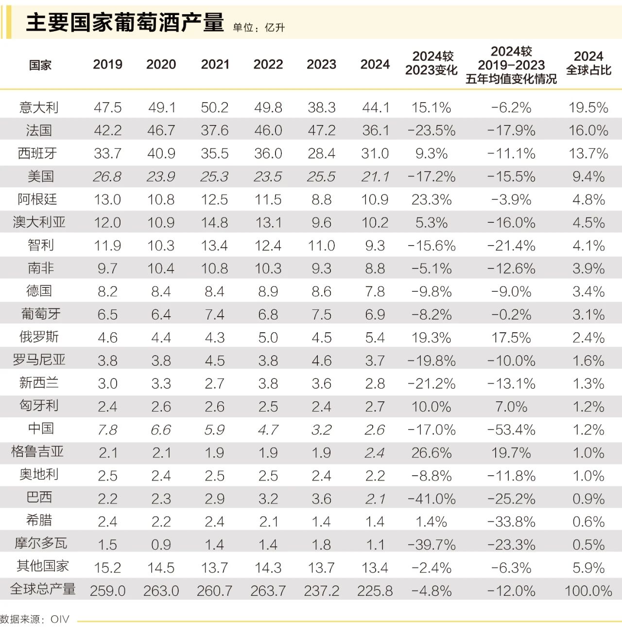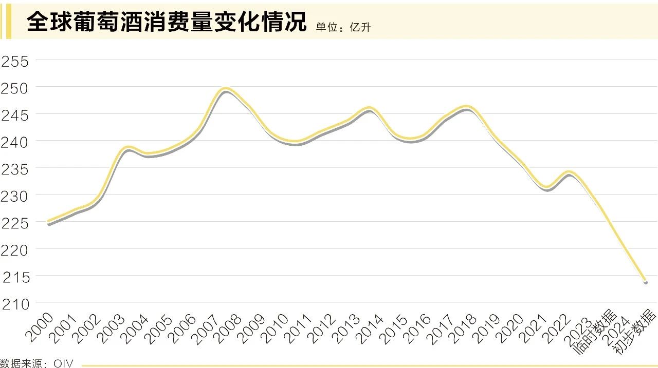 2024年,全球葡萄酒行業面臨的挑戰揭示了深刻的轉型需求。產量與消費量雙雙跌至1961年以來的最低水平,反映出氣候變化的持續影響(如霜霉病的廣泛傳播)與消費習慣的結構性轉變(如年輕消費者偏好變化),正在重塑行業格局。中國市場的表現尤為突出,其消費量暴跌19.3%至5.5億升,產量下降17.0%至2.6億升,同時,進口量反彈13.7%至2.8億升,這一矛盾現象凸顯了本土產業面臨的轉型壓力。