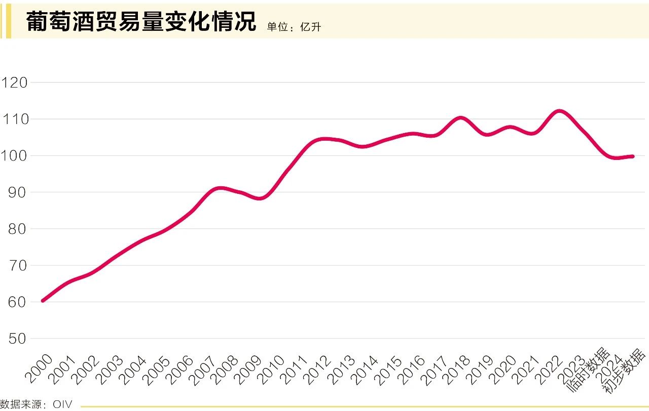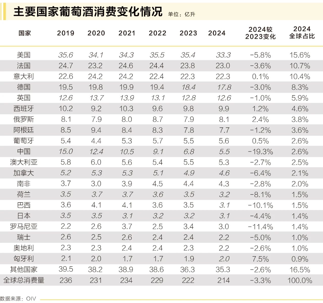 2024年,全球葡萄酒消費量下降3.3%至214.2億升,創1961年以來最低值。傳統市場普遍增長放緩:中國消費量暴跌19.3%至5.5億升,自2018年年均減少2億升;美國消費量下降5.8%至33.3億升,Z世代轉向精釀啤酒與即飲雞尾酒(RTD)導致商超渠道銷量減少12%;歐盟消費量減少2.8%至103.6億升,老齡化與家庭消費收縮為主要拖累因素,法國(23.0億升,-3.6%)與德國(17.8億升,-3.0%)餐飲渠道銷量分別下降8%與6%,西班牙(9.9億升,+1.2%)通過低價散裝酒內銷策略,成為歐盟唯一增長市場。