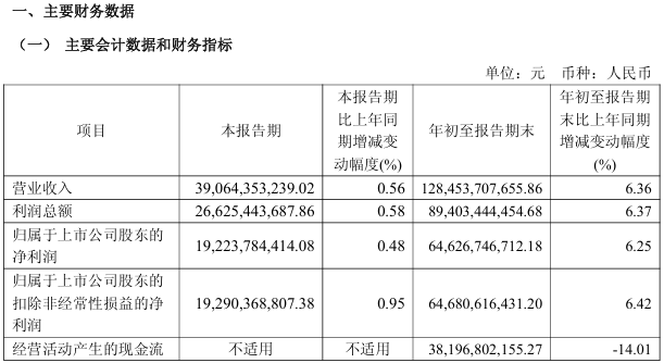 單看第三季度,公司實現營業收入390.64億元,同比微增0.56%;歸母凈利潤192.24億元,同比增長0.48%,增速較前期明顯放緩。