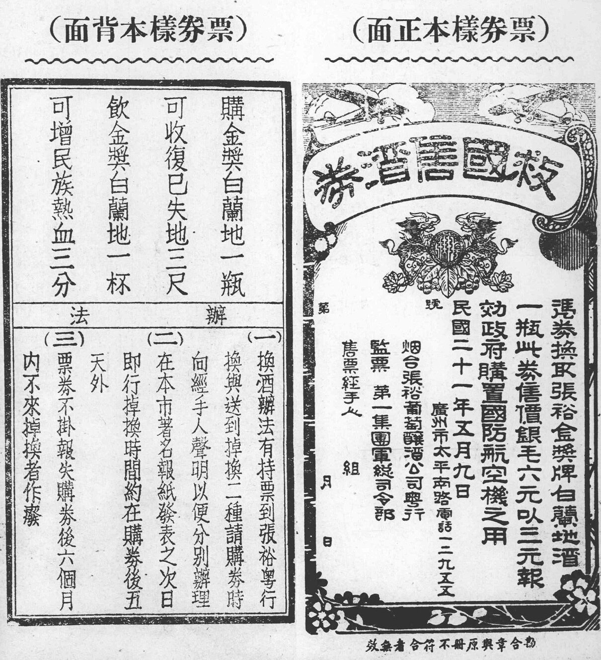 “救國售酒券”背后印著激蕩人心的口號:“購金獎白蘭地一瓶,可收復已失地三尺;飲金獎白蘭地一杯,可增民族熱血三分。”