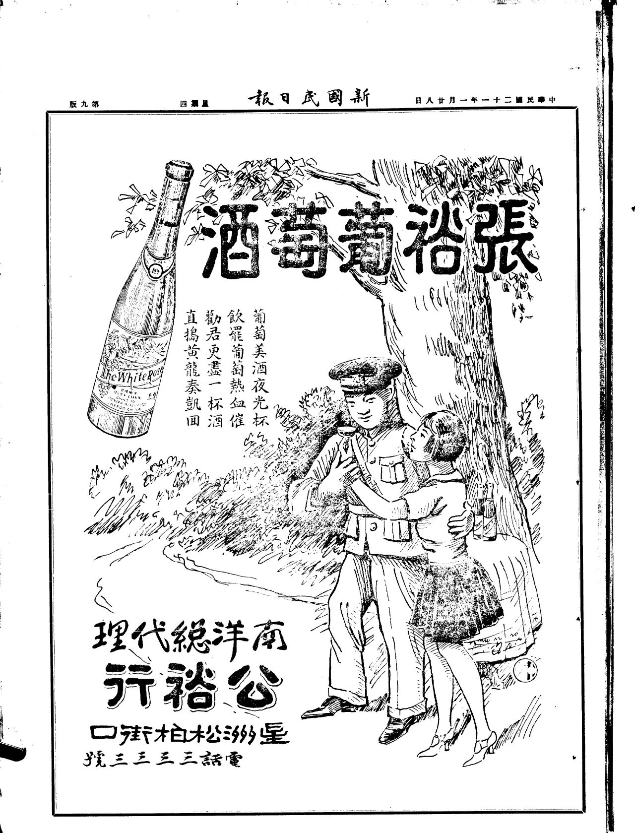 1932年1月28日午夜,“淞滬抗戰(zhàn)”爆發(fā)。就在這一天的白天,張裕葡萄酒南洋總代理已經(jīng)在新加坡《新國民日報》發(fā)布廣告,向南洋華僑召喚、為前線將士助威。