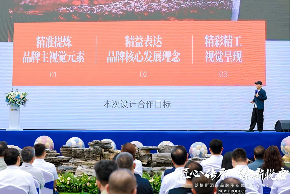 深圳卓上設計創始人武寬夫也從美學出發,分享了新品設計理念,強調在共性與個性之間探尋品牌獨有的視覺錨點,以極簡而純粹的設計語言傳遞朗格斯酒莊深厚的釀造傳統與中西交融的文化底蘊。通過提煉品牌建筑中的歐洲浪漫詩意元素,融合現代東方審美,塑造出高端多元、易識易記的品牌視覺系統,詮釋了朗格斯“品牌logo是最重要的品牌印記”,使每一款新品不僅承載風土之美,更成為連接消費者情感與記憶的媒介。