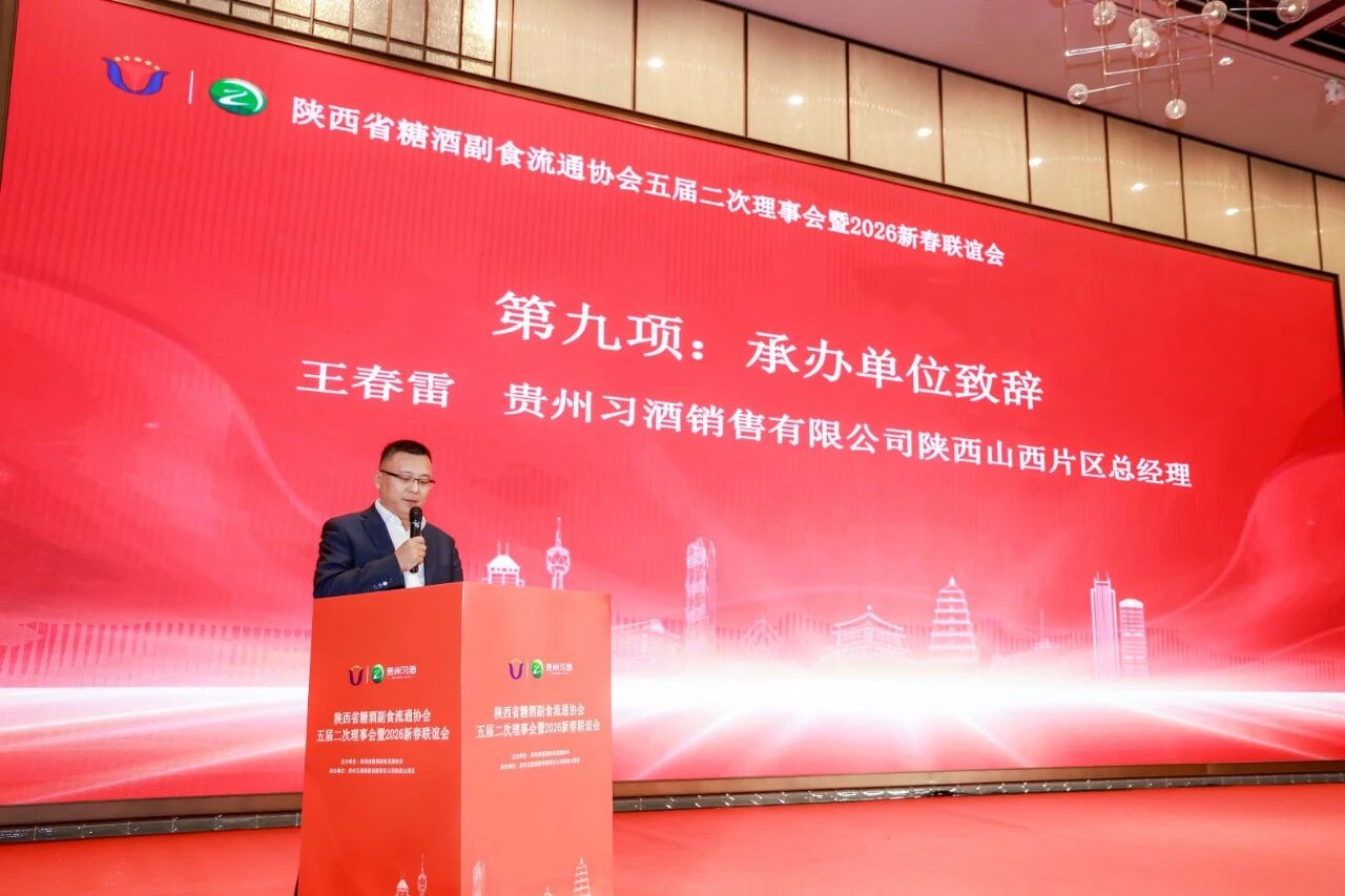 1月16日,陜西省糖酒副食流通協會五屆二次理事會暨2026新春聯誼會在西安洲際酒店舉行。本屆大會由陜西省糖酒副食流通協會主辦,貴州習酒銷售有限責任公司陜西山西區承辦,省商務廳有關部門同志和省市場監督管理局有關部門負責人出席會議,來自全省糖酒副食流通行業的企業代表、協會會員單位、有關商協會負責人、新聞媒體代表300 余人齊聚一堂,本次大會旨在系統總結協會第五屆理事會2025年的工作成果與經驗,共同分析當前陜西糖酒副食流通行業面臨的新形勢與新機遇,并擘畫2026年的發展藍圖,這場承前啟后、凝聚行業力量的酒業盛會。