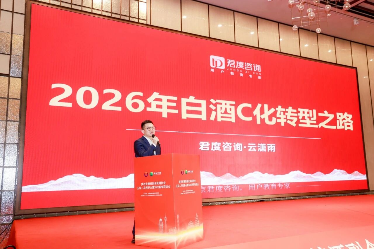會議期間,北京君度咨詢有限公司總經理云瀟雨作《中國酒業消費趨勢與陜西酒業破局之道》主題演講。云瀟雨從2026白酒行業觀察、白酒企業 C 化轉型之路等角度詳細解讀了2026年白酒 C 化轉型之路。