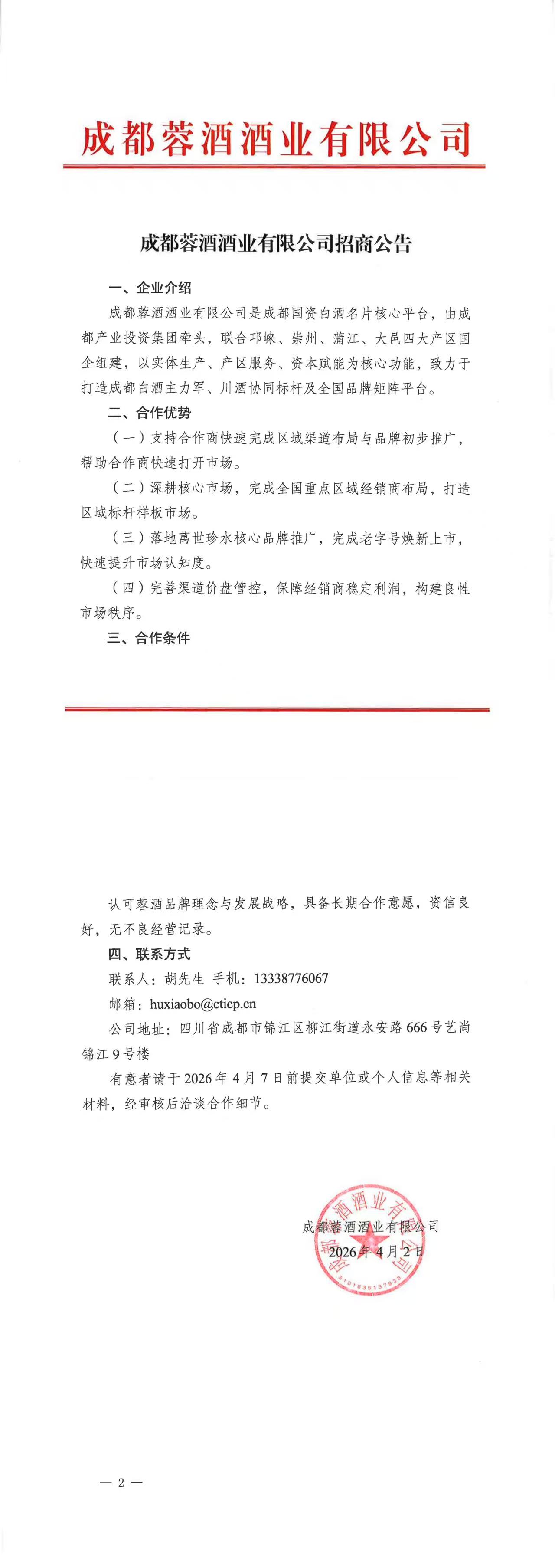 4月2日,成都蓉酒酒業有限公司(簡稱:蓉酒公司)正式發布招商公告,面向全國誠邀優質經銷商合作共贏。